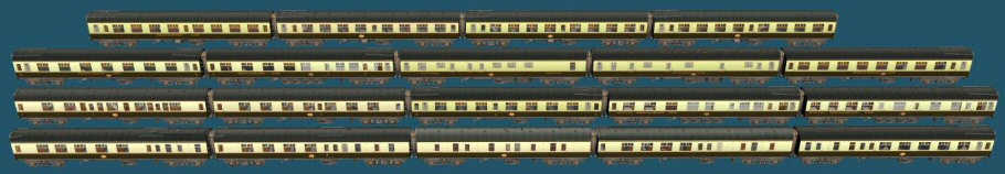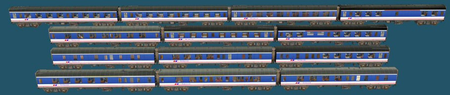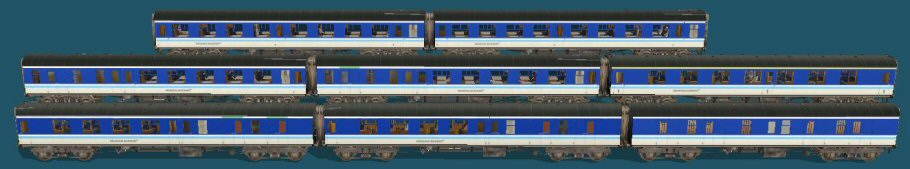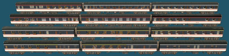 These are the 3 types of Mk1 coaches which appeared in the Inter-City Charter livery, the FK in the Motorail livery, and the RB with the INTERCITY branding. These coaches were created in cooperation with Dave (nexusdj) Types included are; |