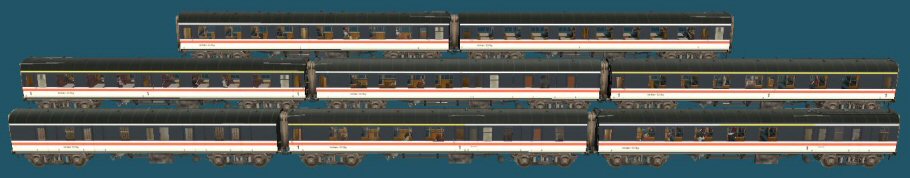 These are 13 of the Mk1 coaches in the Inter-City livery. These coaches were created in cooperation with Dave (nexusdj) Types included are; |